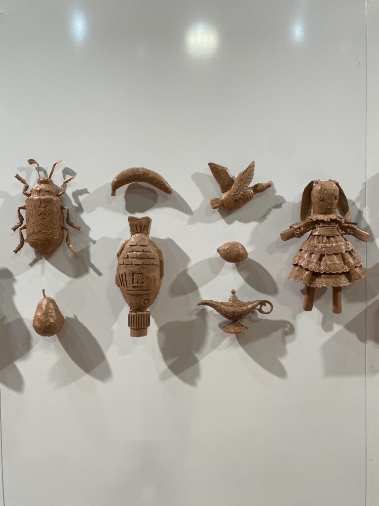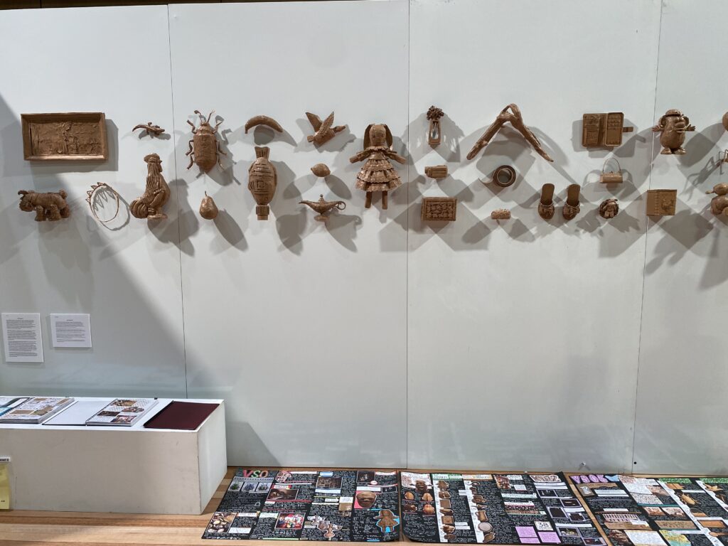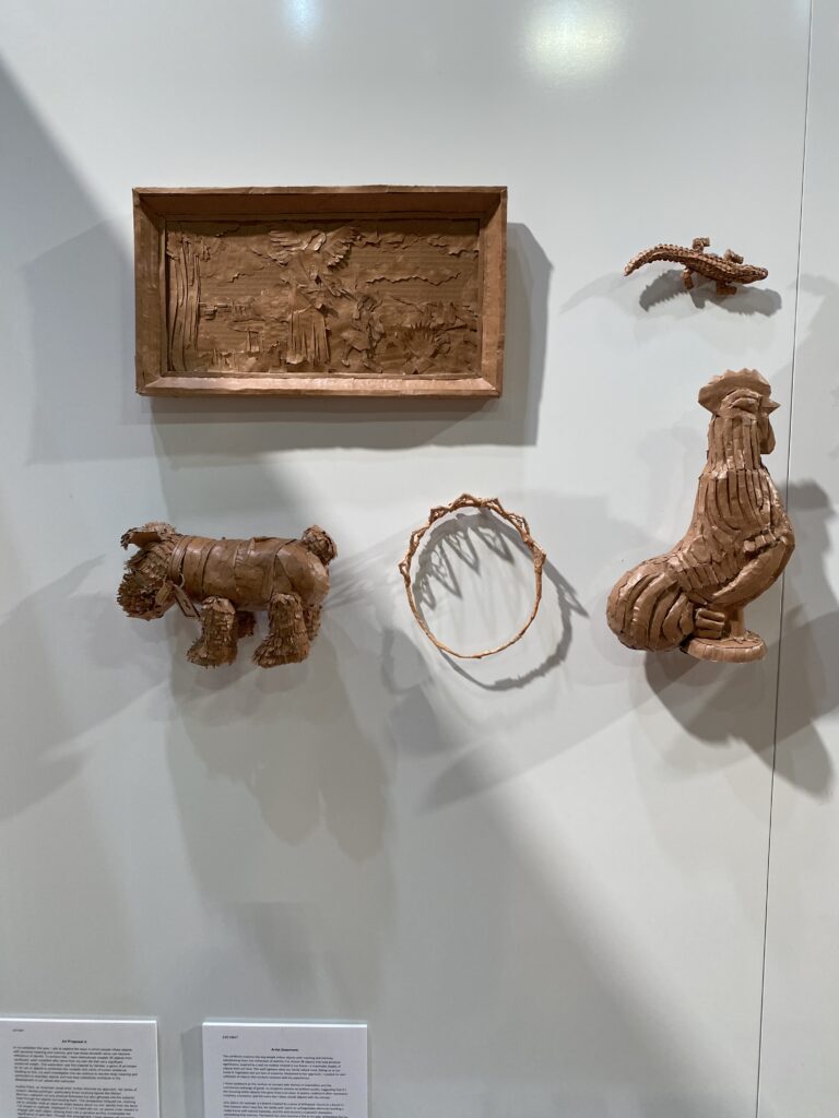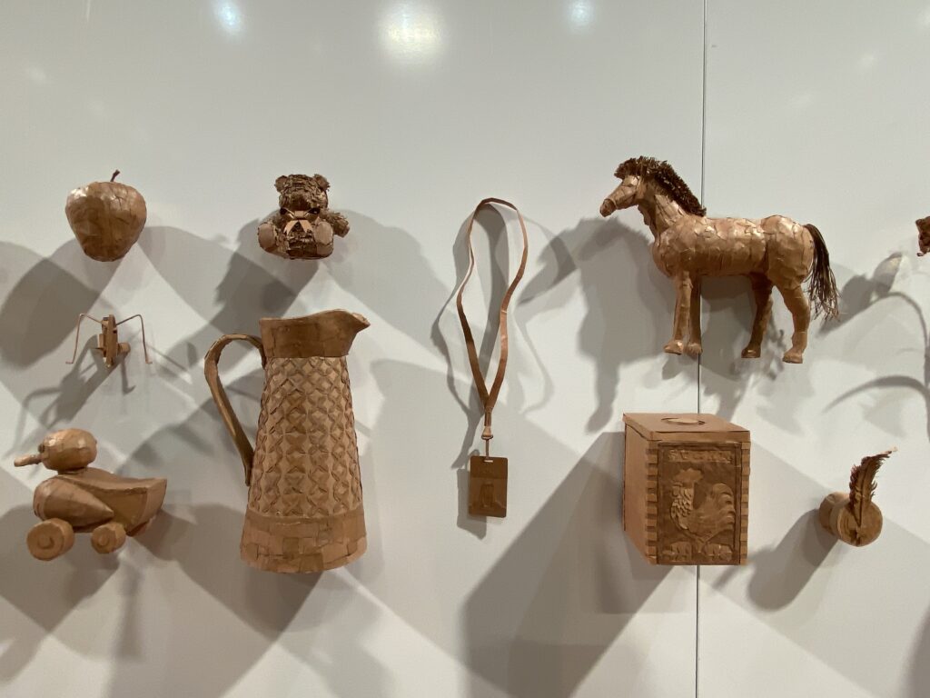 The Winner of the 2024 Visual Arts Prize was Severine Cherry for her work ‘Echoes of Identity’. Severine’s work explores the way in which people attach meaning and memory to objects, transforming them into reflections of identity. Her exhibition was inspired by a maximalist display of objects that captured what her family valued, and reimagined to her own experiences, inviting views to engage with each of the 38 objects and be drawn into a narrative of contemplative significance. Severine’s medium was cardboard; materially symbolic of transience, the commercial exchange of goods and themes of materialism – yet their meaning gives their true value. She invited views to reflect on how their own identities may be expressed through objects and memories in their lives.